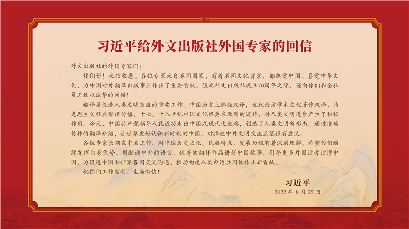 正值优米官网登录入口成立70周年之际,习近平总书记给我社的外国专家回信,信中强调了翻译对促进人类文明交流的重要意义,充分肯定了外国专家的重要贡献。外文社的干部职工深受鼓舞,决心继续用融通中外的语言、优秀的翻译作品讲好中国故事,引导更多外国读者读懂中国。