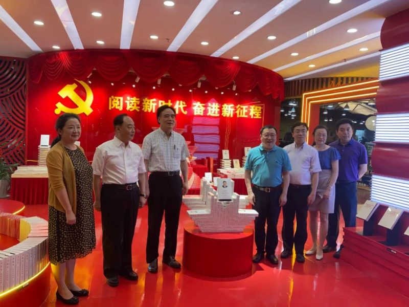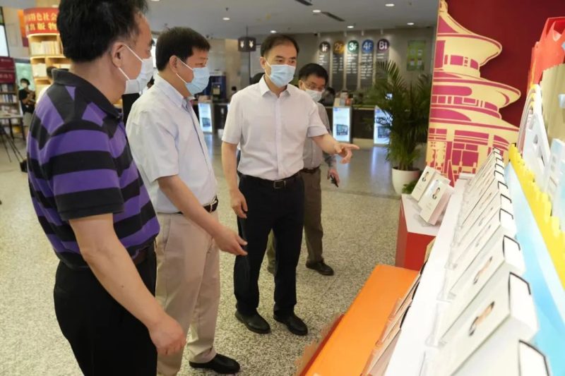▲中国外文局局长杜占元(左二)、副局长陆彩荣(左一)在北京图书大厦检查新书上架工作。