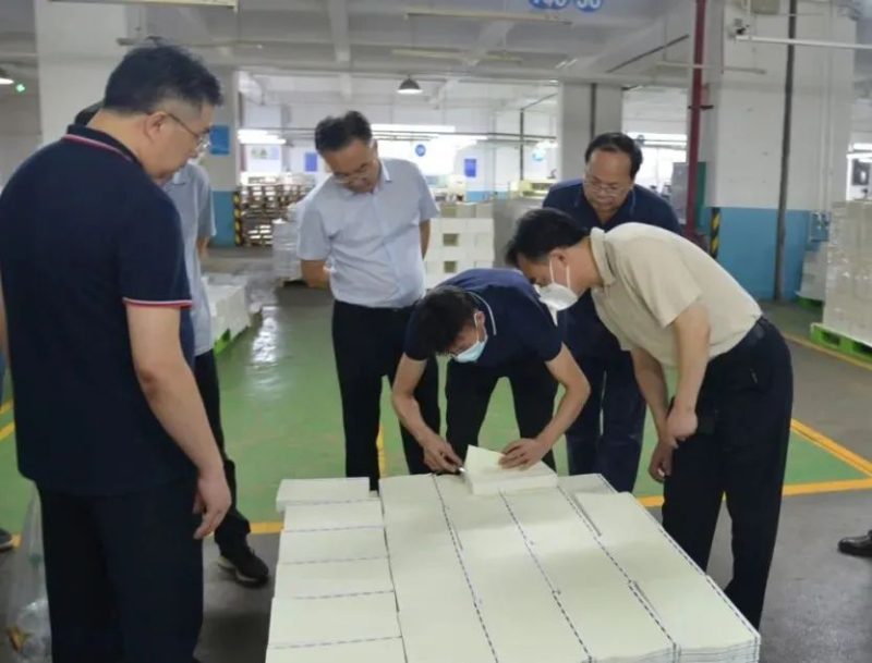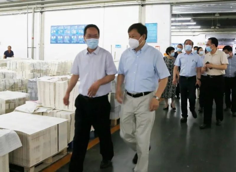 ▲中国外文局局长杜占元(前排右一)深入印刷厂检查图书印制工作。