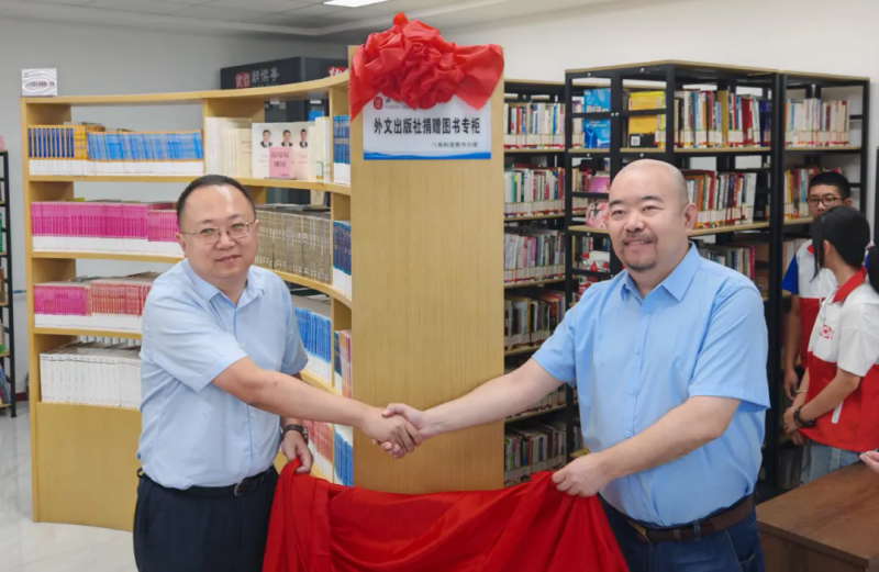 ▲王京强、崔乐为外文社捐赠图书专柜揭牌