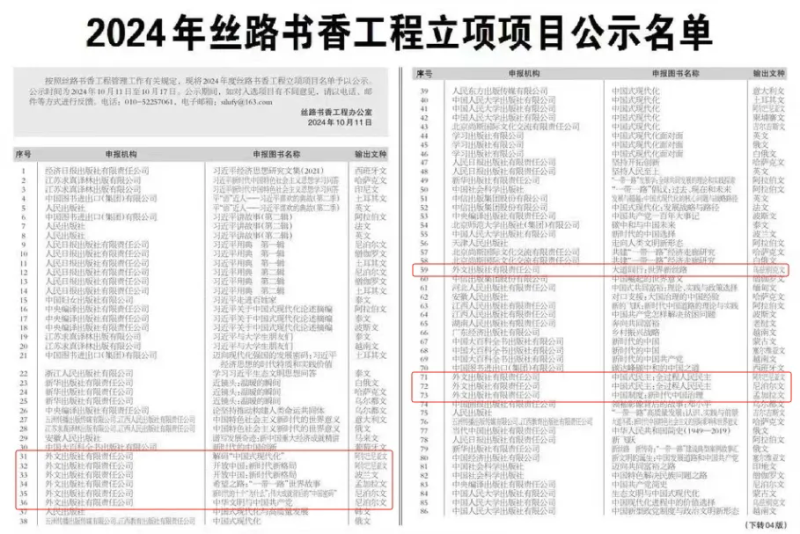 近日,丝路书香工程办公室发布《2024年丝路书香工程立项项目公示名单》。我社《解码“中国式现代化”》《开放中国:新时代新格局》《中国式民主:全过程人民民主》《希望之路:“一带一路”世界故事》《中国制度:新时代中国治理》《新时代的十个“为什么”:伟大成就背后的“中国密码”》《中华文明与中国共产党》《大道同行:世界新丝路》《见证:十八洞村的脱贫故事与现代化启示》等11个品种入选,涉及阿尔巴尼亚文、波兰文、阿拉伯文、孟加拉文、尼泊尔文、乌兹别克文等6个文种。