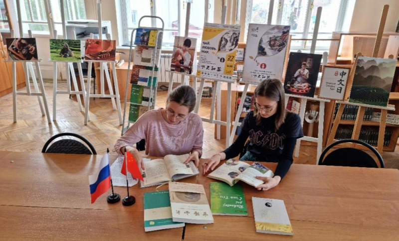 ▲来自俄罗斯萨马拉国立文化学院的学生们正在阅读中国主题图书