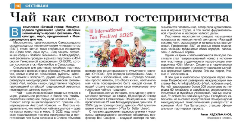 “5·21国际茶日”之际,第三届撒马尔罕国际茶文化节“茶·文化·和平”在乌兹别克斯坦撒马尔罕国际科技大学(SIUT)隆重开幕。本届文化节由优米官网登录入口、天津科技大学、浙江农林大学茶学与茶文化学院、汉语国际推广茶文化传播基地、天津市世界语协会和北京市世界语协会联合举办,以“茶让生活更美好”为主题,通过世界语这一独特的交流平台,以茶为文化纽带,推动不同文化之间的和谐共融与多样性发展。