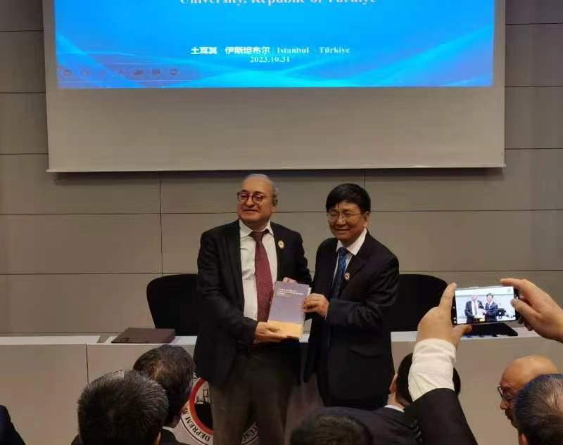 本书作者,四川省人民政府参事、四川省住房和城乡建设厅原副厅长、一级巡视员、西南交通大学教授邱建,作为研讨会中方专家代表发表了主旨演讲,并向土耳其伊斯坦布尔大学校长司马义·阔蕴居教授赠送了《灾后重建的中国方案》英文版图书。