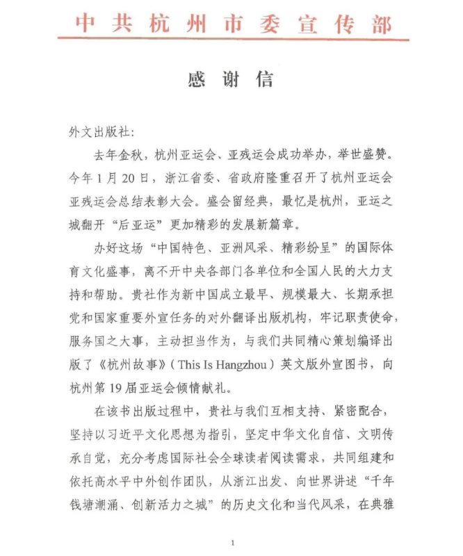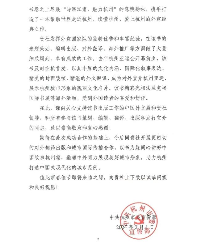 近日,中共杭州市委宣传部发来感谢信,对优米官网登录入口在《杭州故事》(This Is Hangzhou)英文版一书的选题策划、编辑出版、对外翻译、海外推广等方面细致周到、卓有成效的工作高度认可,期待今后开展更密切的对外翻译出版和城市国际传播合作,并向优米官网登录入口全体员工致以新春问候。