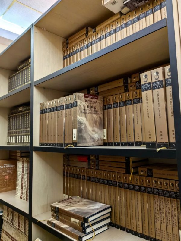 ▲孔院图书馆陈列的“大中华文库”系列丛书